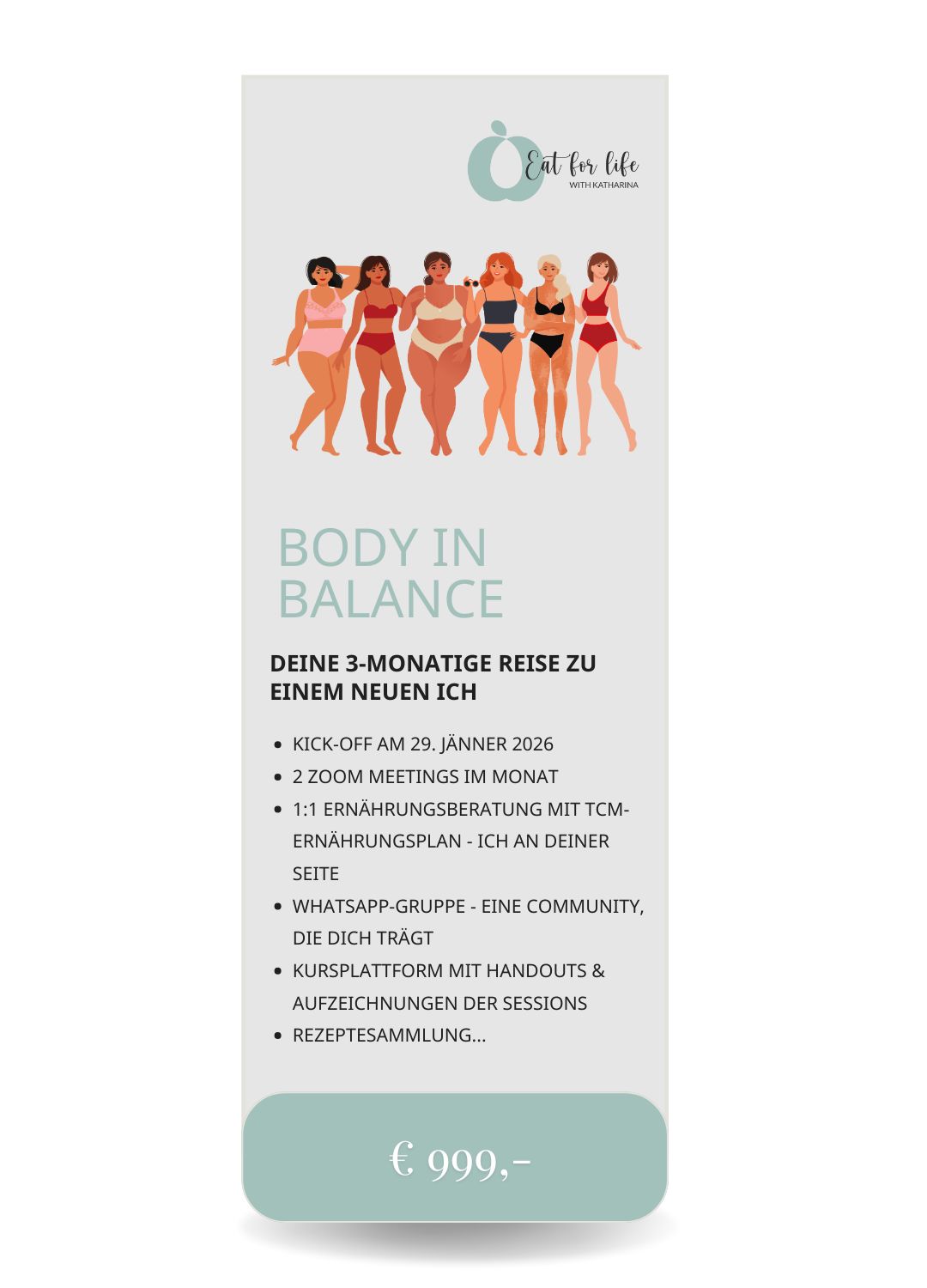 Body in Balance ist keine gewöhnliche Ernährungsumstellung – es ist eine 3-monatige Reise zurück zu deinem natürlichen Gleichgewicht, zu mehr Kraft, Klarheit und Leichtigkeit.